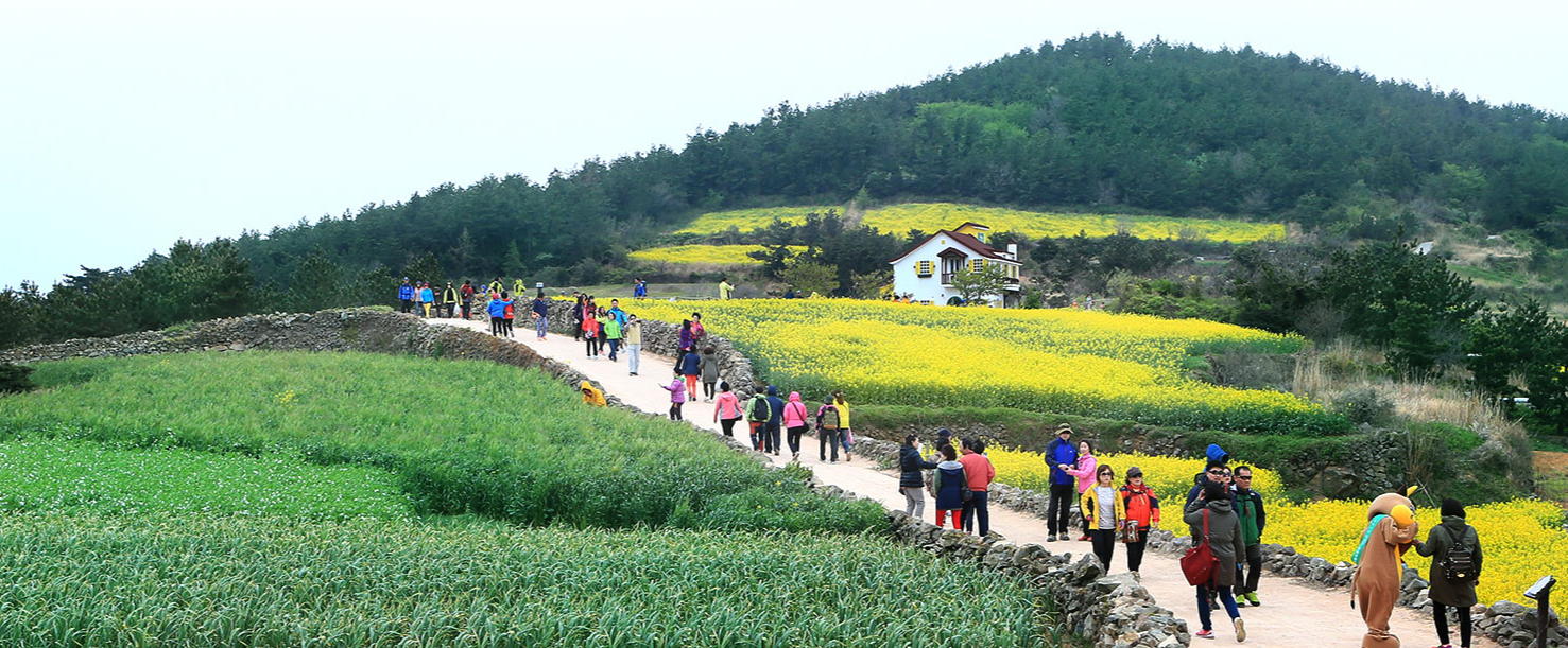 3~4월에는 청산도 전체가 노란 유채꽃과 푸른 청보리로 물듭니다. ‘서편제’ 촬영지로 유명한 도청리 돌담길은 사진 명소입니다.