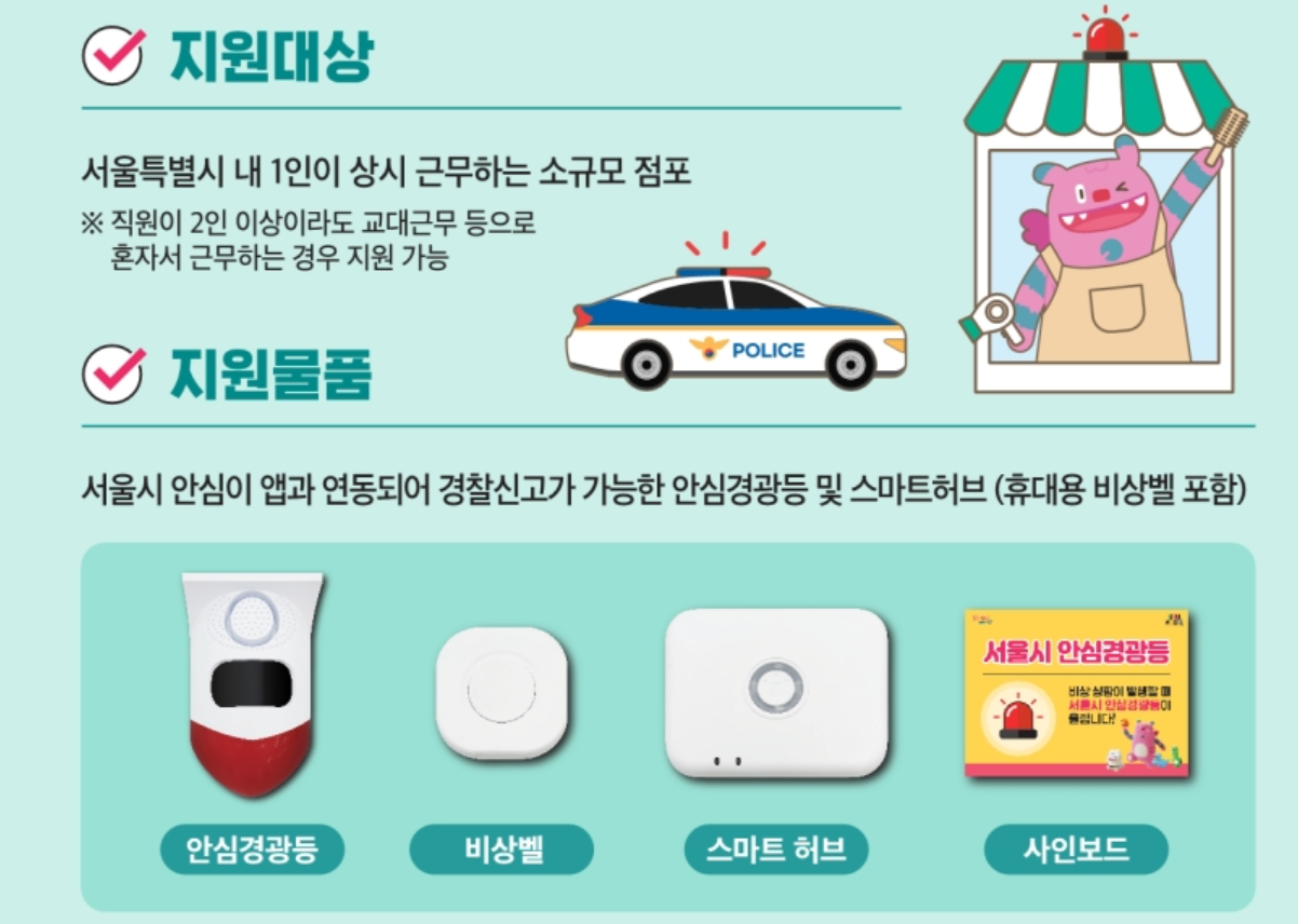 서울시는 혼자 근무하는 소규모 자영업자들의 범죄 불안감을 해소하고, 실제 위급상황 시 빠른 대응이 가능하도록 ‘안심경광등’을 보급하는 사업을 진행하고 있습니다.