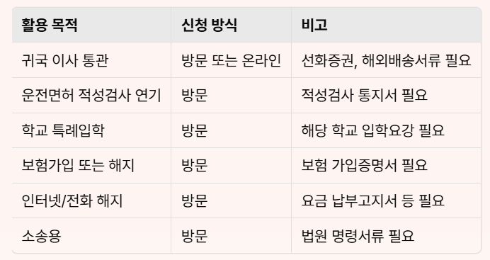 해외 출입국 기록이 필요한 경우, 가장 공식적이고 신뢰할 수 있는 서류가 바로 출입국에 관한 사실증명서입니다. 이 증명서는 각종 행정 업무, 유학, 이민, 특례입학, 보험, 운전면허 적성검사 등 다양한 용도로 활용되며, 특히 귀국 후 생활 정리나 입증이 필요한 상황에서 매우 유용합니다.