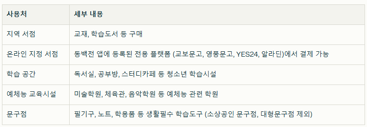 다자녀 교육지원포인트는 교육 및 학습에 직접적으로 도움이 되는 곳에서만 사용할 수 있도록 제한되어 있으며, 다음과 같은 장소에서 사용 가능합니다.