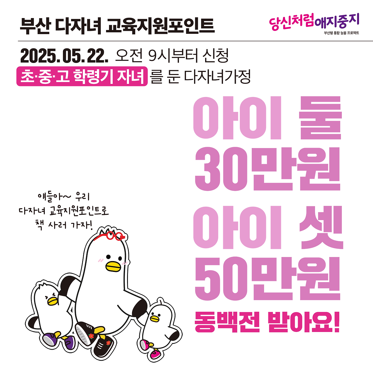 부산시는 자녀 양육 부담을 줄이고 교육비를 지원하기 위해 다자녀 교육지원포인트 제도를 운영하고 있습니다. 2007년부터 2018년 사이 출생한 자녀를 둔 다자녀 가정을 대상으로 연 1회 최대 50만원까지 지급되는 정책으로, 2025년에는 신청 절차가 더욱 간소화되어 다자녀 가정의 편의가 획기적으로 향상되었습니다. 이번 글에서는 사업 개요부터 신청 방법, 2025년 달라지는 사항까지 상세하게 안내드리겠습니다.