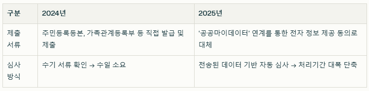 2025년에는 공공마이데이터 서비스가 본격적으로 연계되면서 신청자 편의성이 획기적으로 개선되었습니다. 기존에는 자격 심사를 위한 서류 제출이 필수였으나, 이제는 본인 정보 제공 동의만으로 신청 가능해졌습니다.