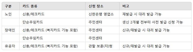 - 장애인 및 유공자는 체크카드 신청 시 우체국 또는 신한은행 통장 사본 필요