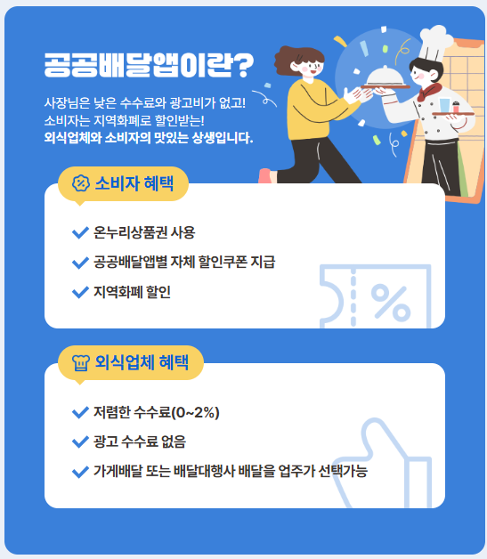 민간배달앱의 과도한 중개수수료와 광고비로부터 소상공인을 보호하고, 동시에 소비자에게 실질적인 할인 혜택을 제공함으로써 소상공인-소비자 모두가 혜택을 보는 구조로 설계된 것이 특징입니다.