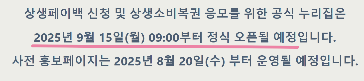 - 공식 신청은 2025년 9월 15일부터 10월 12일까지 상생페이백 누리집(상생페이백.kr)을 통해 1회만 접수하면 됩니다. (복수 신청 불필요)