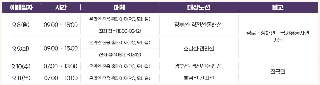 특히, 명절 특별 예매 기간에는 역 창구·키오스크·TMO(군) 창구 등에서는 발매하지 않으므로 반드시 온라인·전화 예매만 이용해야 합니다.