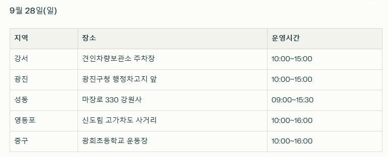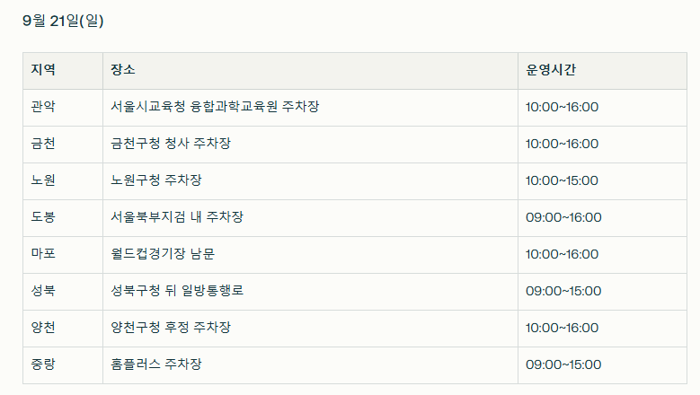 2025년 추석 귀향 대비 무상점검은 서울시 22개 자치구에서 순차적으로 진행되며, 장소는 구청 주차장, 교육청, 공원 인근 등 시민들이 쉽게 접근할 수 있는 곳으로 마련되었습니다.