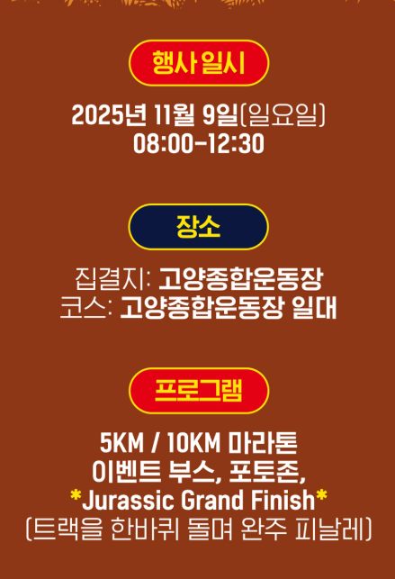 ‘쥬라기파크 런 2025’는 단순히 달리는 행사가 아니라, 공룡 테마를 입은 몰입형 체험형 축제입니다. 가을의 선선한 공기를 맞으며, 영화 속 공룡 세계를 직접 달려보는 색다른 경험은 아이들에게는 꿈 같은 추억, 어른들에게는 새로운 힐링의 시간이 될 것입니다.