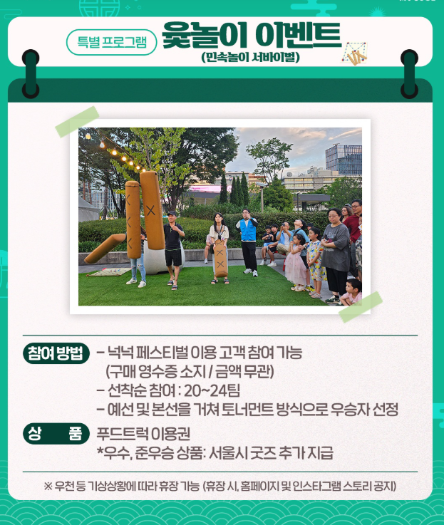 특히 최근 전 세계적으로 돌풍을 일으킨 ‘케이팝데몬헌터스’ 열풍과 함께 한국 문화에 대한 관심이 높아지는 가운데, 서울시는 ‘음식’을 매개로 한국의 매력을 알리고자 ‘넉넉’을 특별 기획했습니다. 음식뿐만 아니라 전통놀이, 공연까지 함께 마련되어 있어 가족 단위 방문객부터 외국인 관광객까지 모두 만족할 수 있는 복합 문화축제의 장으로 꾸며질 예정입니다.