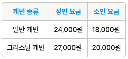 삼악산 케이블카의 요금은 캐빈 종류와 시기에 따라 다르게 책정됩니다.