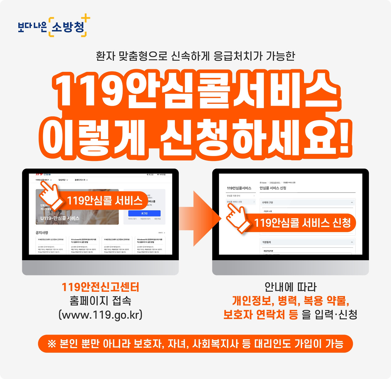 미루지 마시고 지금 바로 119 안전신고센터에 접속하여 119안심콜 서비스를 등록하세요.