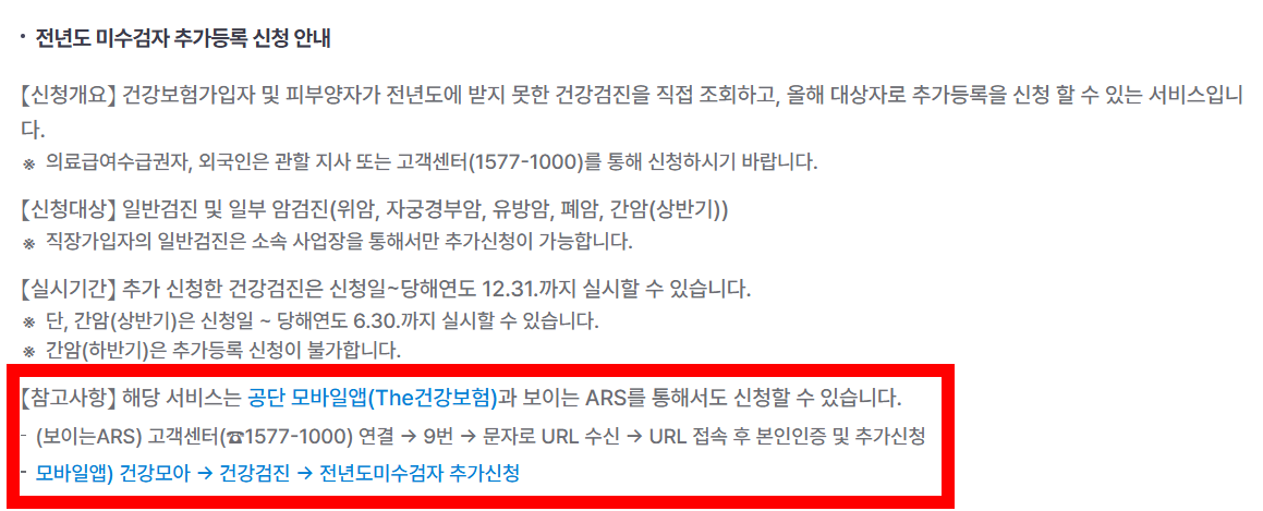 공단은 직접 저년도에 받지 못한 국가건강검진 조회하고 올해 추가로 신청할 수 있는 전년도 미수검자 추가 신청 서비스를 운영하고 있습니다.