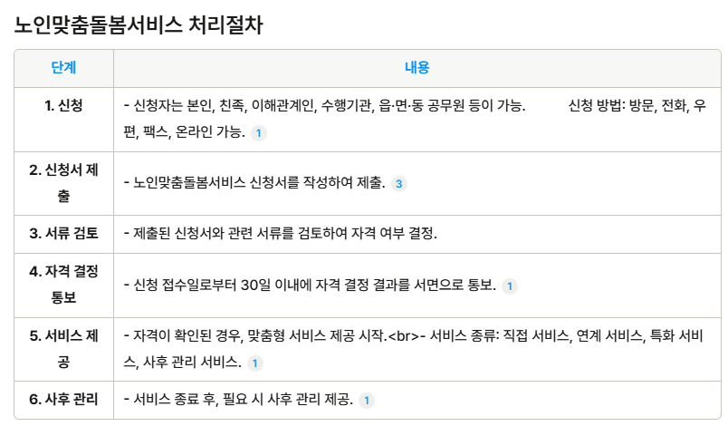 노인맞춤돌봄서비스를 이용하고자 하는 경우, 방문신청과 온라인 신청 방법이 있으며 다음과 같은 절차를 따라 신청할 수 있습니다.