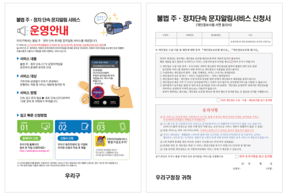 이 시스템은 운전자에게 불법 주·정차 단속 구역임을 사전에 경고하는 서비스입니다. 고정식 또는 이동식 CCTV를 통해 단속 대상이 될 경우, 운전자에게 즉시 안내 메시지가 발송됩니다.