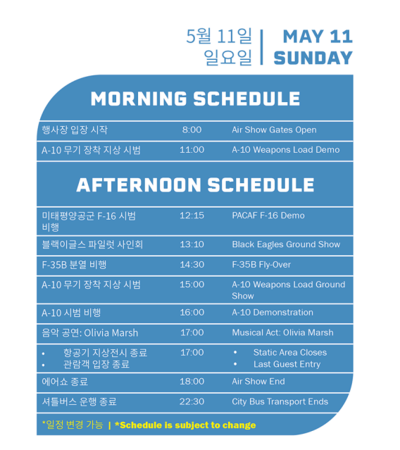 행사 기간 동안 평택시 및 오산시에서는 오산 공군기지까지 운행되는 셔틀버스를 제공합니다.