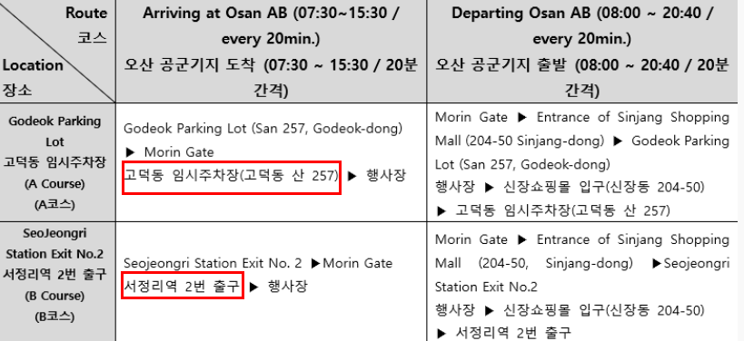 노선 및 시간표는 Osan Air Base 공식 웹사이트 를 통해 추후 확인할 수 있습니다.