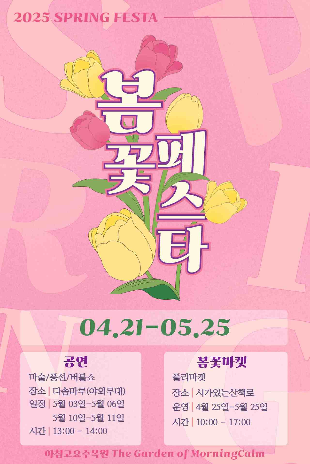 ‘봄꽃페스타’는 아침고요수목원의 대표적인 계절 축제로, 2025년 올해에는 5월 25일까지 진행됩니다. 수목원 전체가 수선화, 튤립, 개나리, 벚꽃, 철쭉 등 다채로운 봄꽃들로 장식되어 봄의 정취를 오감으로 느낄 수 있는 축제입니다.